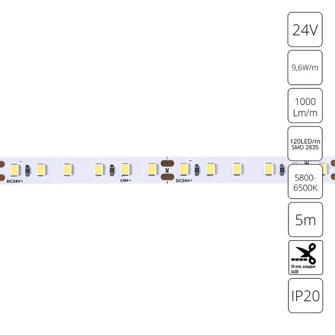 Светодиодная лента 24V 9,6W/m 6000К 5м Arte Lamp TAPE A2412008-03-6K